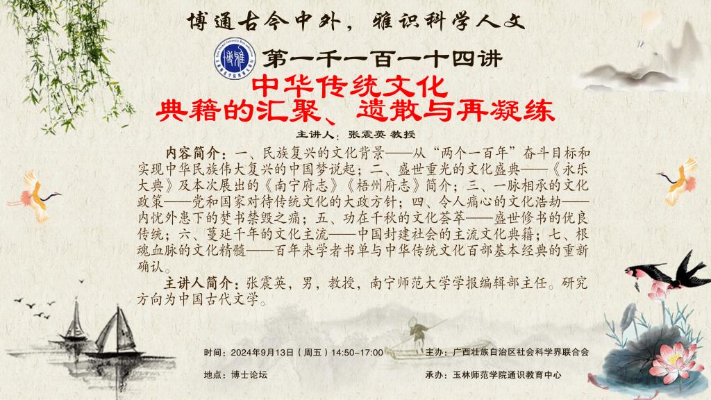 内容简介:一、民族复兴的文化背景——从“两个一百年”奋斗目标和实现中华民族伟大复兴的中国梦说起;二、盛世重光的文化盛典——《永乐大典》及本次展出的《南宁府志》《梧州府志》简介;三、一脉相承的文化政策——党和国家对待传统文化的大政方针;四、令人痛心的文化浩劫——内忧外患下的焚书禁毁之痛;五、功在千秋的文化荟萃——盛世修书的优良传统;六、蔓延千年的文化主流——中国封建社会的主流文化典籍;七、根魂血脉的文化精髓——百年来学者书单与中华传统文化百部基本经典的重新确认。