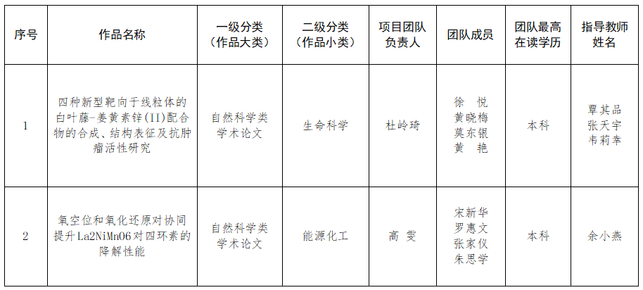 根据第十八届“挑战杯”全国大学生课外学术科技作品竞赛规则和评审要求,经学生团队申报、KY.COM选拔、广西终审决赛评委会评审,我校拟推荐《四种新型靶向于线粒体的白叶藤-姜黄素锌(II)配合物的合成、结构表征及抗肿瘤活性研究》等2件作品参加第十八届“挑战杯”全国大学生课外学术科技作品竞赛,具体信息如下。